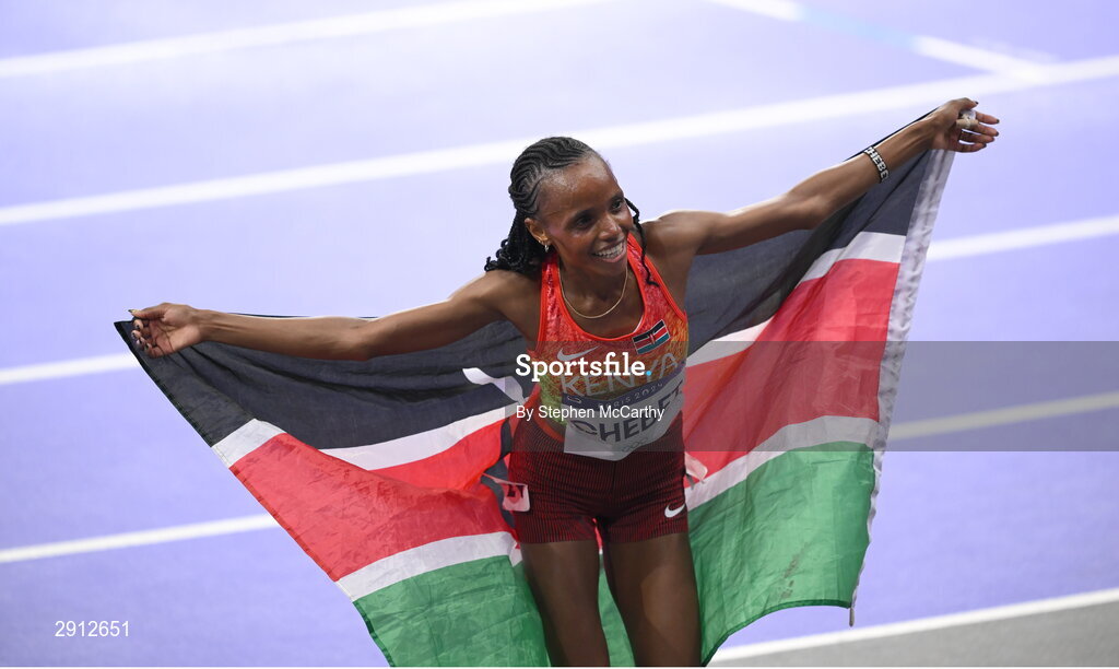 9 August 2024; Beatrice Chebet of Team Kenya celebrates after winning the women's 10,000m final at the Stade de France during the 2024 Paris Summer Olympic Games in Paris, France. Photo by Stephen McCarthy/Sportsfile