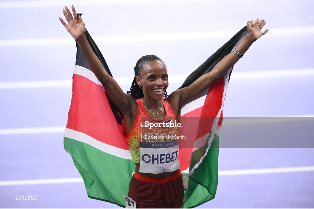 9 August 2024; Beatrice Chebet of Team Kenya celebrates after winning the women's 10,000m final at the Stade de France during the 2024 Paris Summer Olympic Games in Paris, France. Photo by Stephen McCarthy/Sportsfile