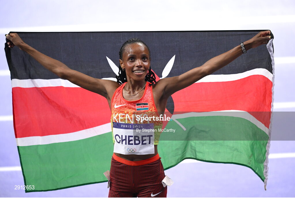 9 August 2024; Beatrice Chebet of Team Kenya celebrates after winning the women's 10,000m final at the Stade de France during the 2024 Paris Summer Olympic Games in Paris, France. Photo by Stephen McCarthy/Sportsfile