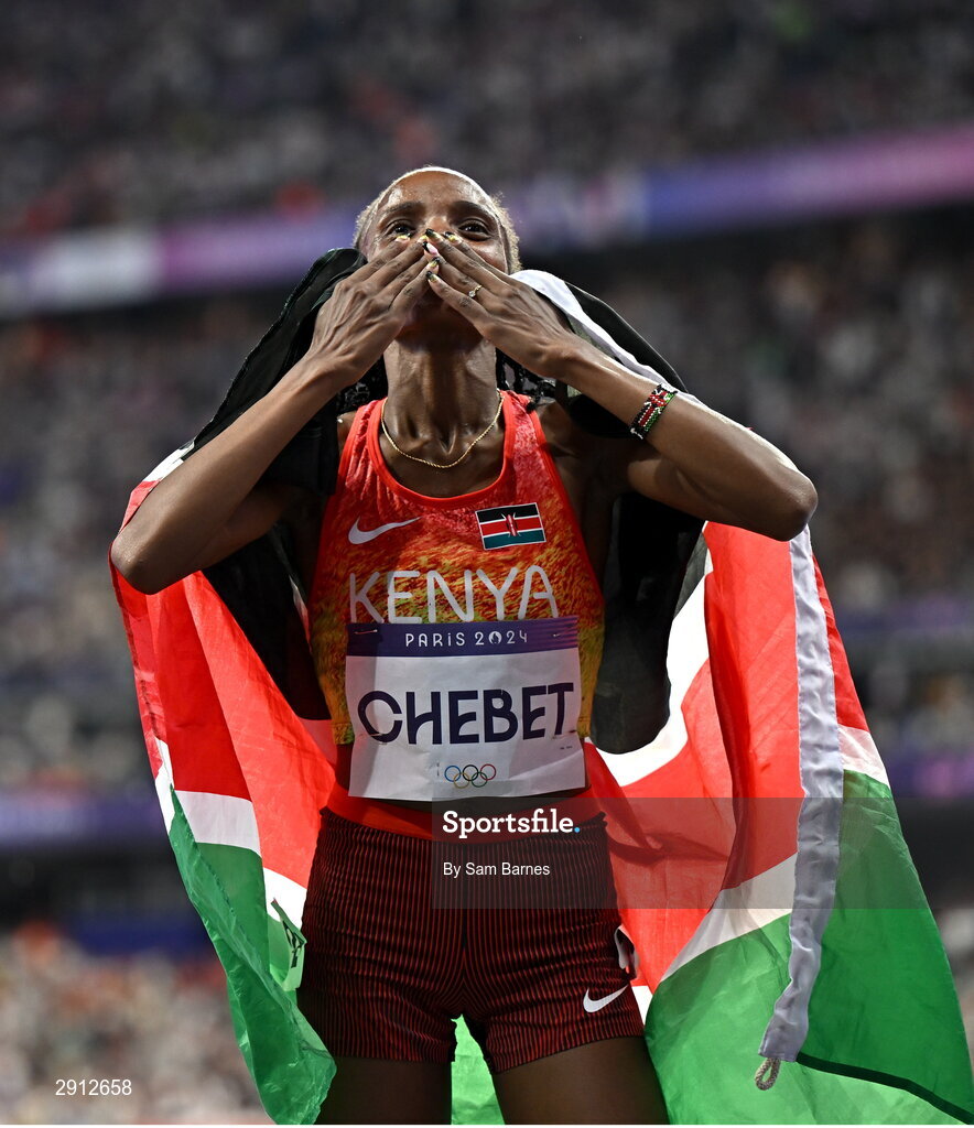 9 August 2024; Beatrice Chebet of Team Kenya celebrates after winning the women's 10,000m final at the Stade de France during the 2024 Paris Summer Olympic Games in Paris, France. Photo by Sam Barnes/Sportsfile