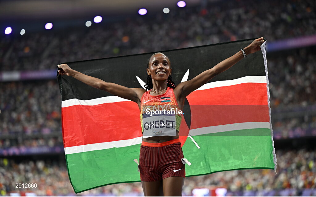 9 August 2024; Beatrice Chebet of Team Kenya celebrates after winning the women's 10,000m final at the Stade de France during the 2024 Paris Summer Olympic Games in Paris, France. Photo by Sam Barnes/Sportsfile
