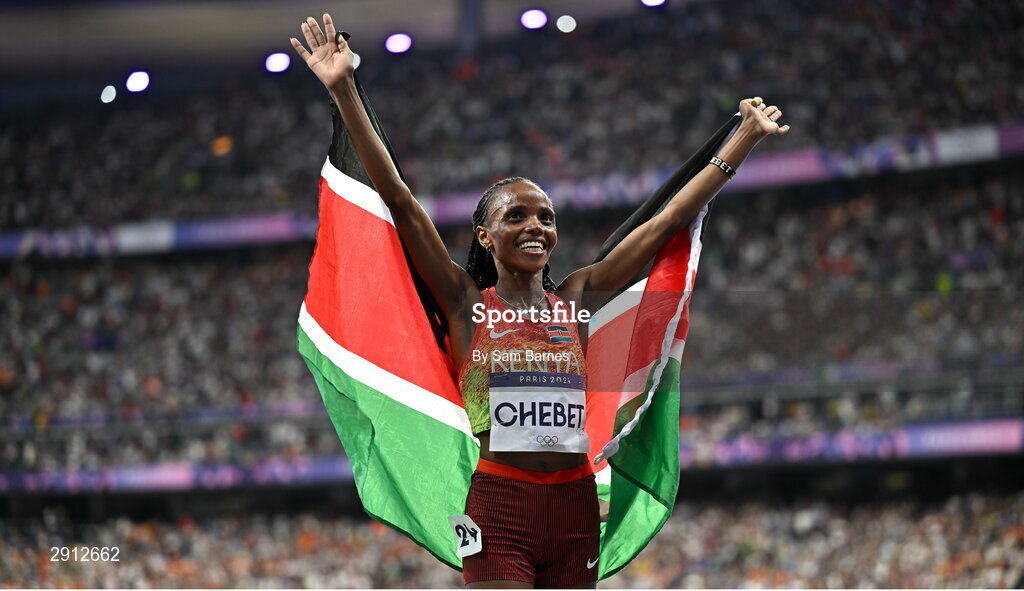 9 August 2024; Beatrice Chebet of Team Kenya celebrates after winning the women's 10,000m final at the Stade de France during the 2024 Paris Summer Olympic Games in Paris, France. Photo by Sam Barnes/Sportsfile