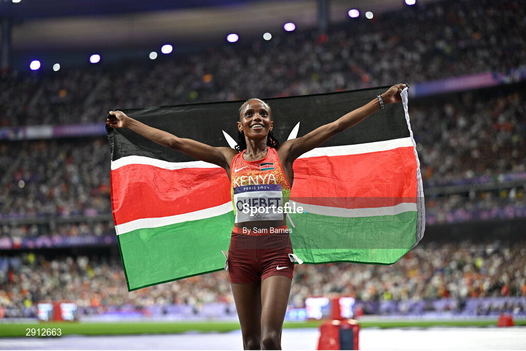9 August 2024; Beatrice Chebet of Team Kenya celebrates after winning the women's 10,000m final at the Stade de France during the 2024 Paris Summer Olympic Games in Paris, France. Photo by Sam Barnes/Sportsfile