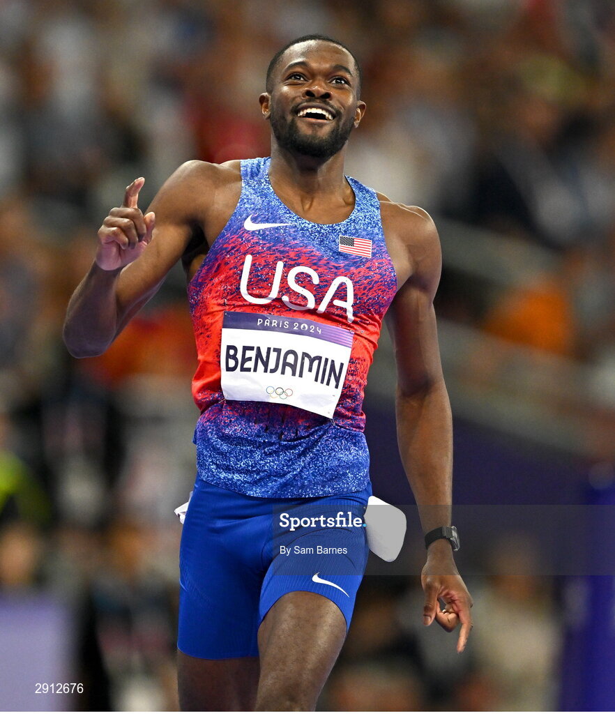 9 August 2024; Rai Benjamin of Team USA celebrates after winning the men's 400m hurdles final at the Stade de France during the 2024 Paris Summer Olympic Games in Paris, France. Photo by Sam Barnes/Sportsfile