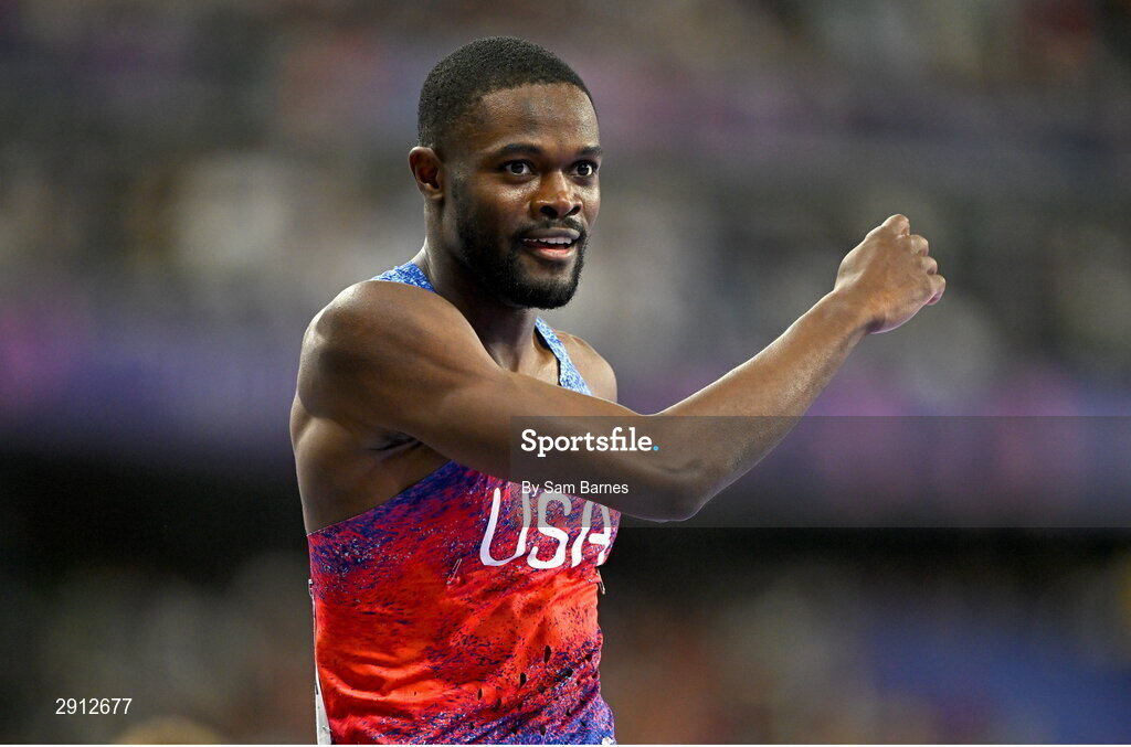 9 August 2024; Rai Benjamin of Team USA celebrates after winning the men's 400m hurdles final at the Stade de France during the 2024 Paris Summer Olympic Games in Paris, France. Photo by Sam Barnes/Sportsfile