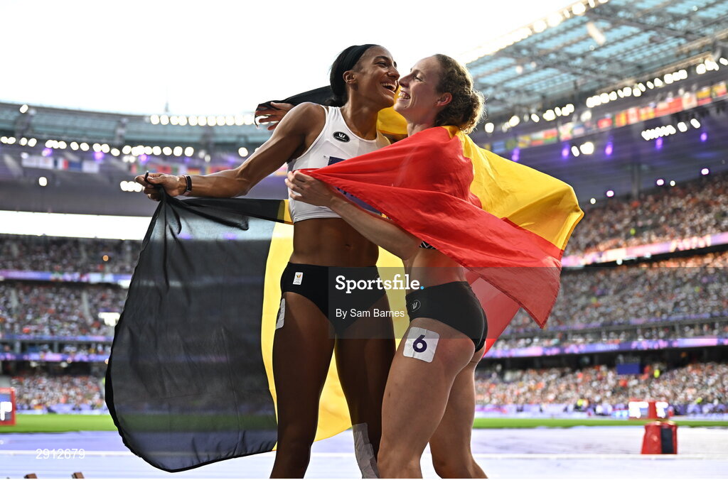 9 August 2024; Nafissatou Thiam, left, and Noor Vidts of Team Belgium after the women's 800m heptathlon final at the Stade de France during the 2024 Paris Summer Olympic Games in Paris, France. Photo by Sam Barnes/Sportsfile