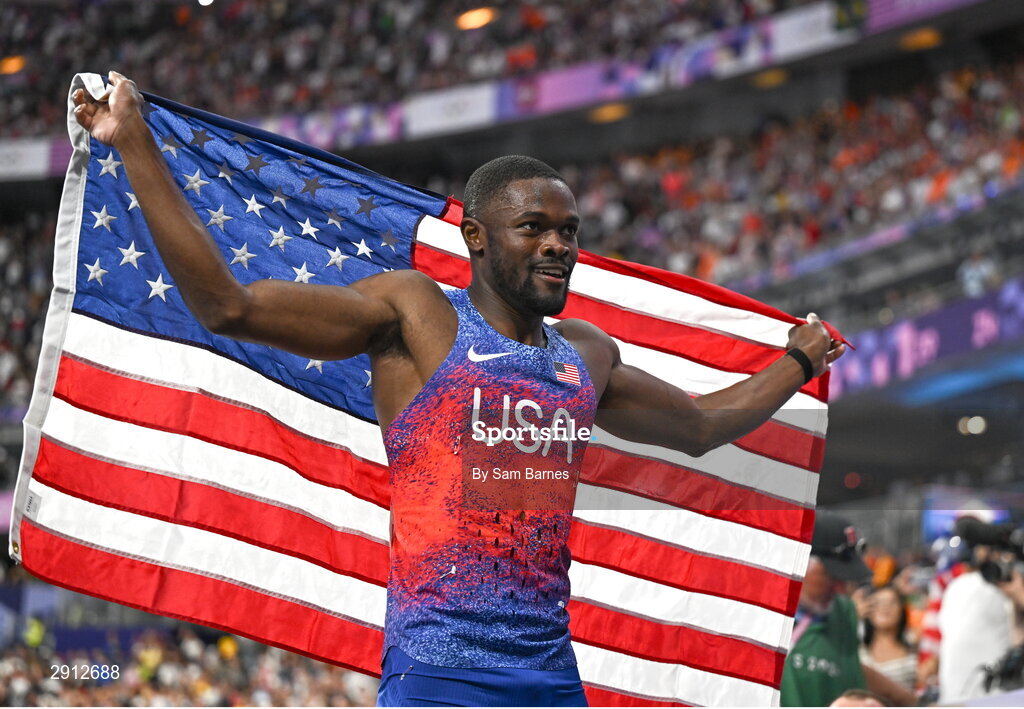 9 August 2024; Rai Benjamin of Team USA celebrates after winning the men's 400m hurdles final at the Stade de France during the 2024 Paris Summer Olympic Games in Paris, France. Photo by Sam Barnes/Sportsfile