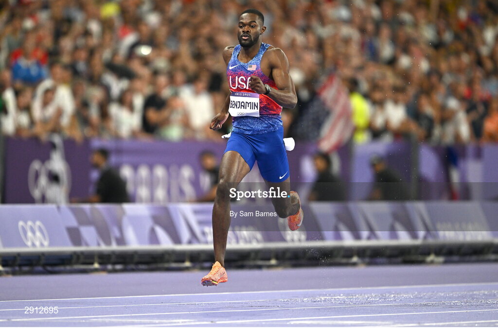 9 August 2024; Rai Benjamin of Team USA crosses the finish line to win the men's 400m hurdles final at the Stade de France during the 2024 Paris Summer Olympic Games in Paris, France. Photo by Sam Barnes/Sportsfile