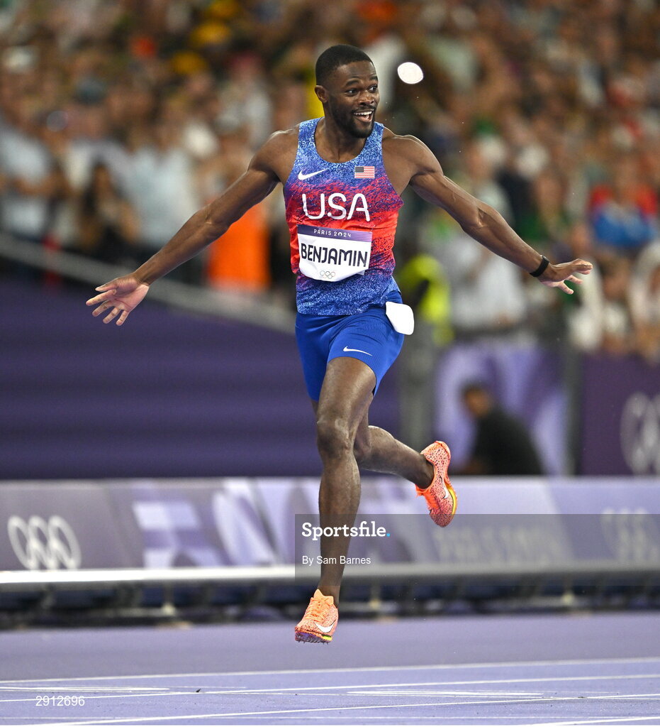9 August 2024; Rai Benjamin of Team USA celebrates after winning the men's 400m hurdles final at the Stade de France during the 2024 Paris Summer Olympic Games in Paris, France. Photo by Sam Barnes/Sportsfile