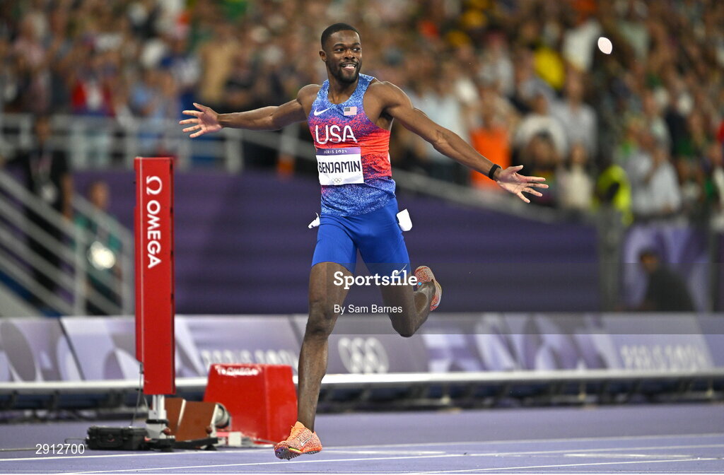 9 August 2024; Rai Benjamin of Team USA celebrates after winning the men's 400m hurdles final at the Stade de France during the 2024 Paris Summer Olympic Games in Paris, France. Photo by Sam Barnes/Sportsfile