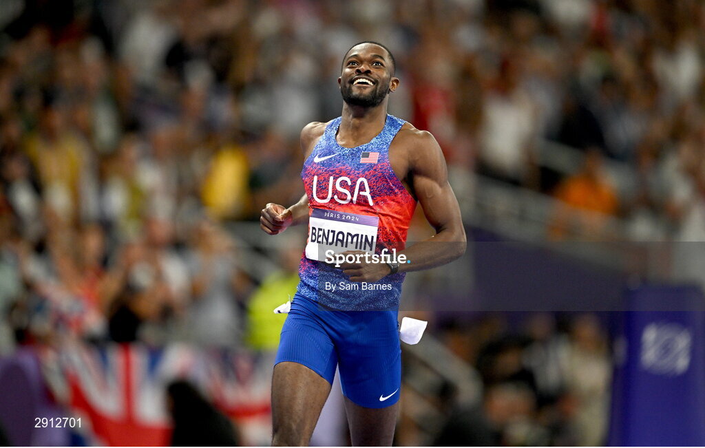 9 August 2024; Rai Benjamin of Team USA celebrates after winning the men's 400m hurdles final at the Stade de France during the 2024 Paris Summer Olympic Games in Paris, France. Photo by Sam Barnes/Sportsfile