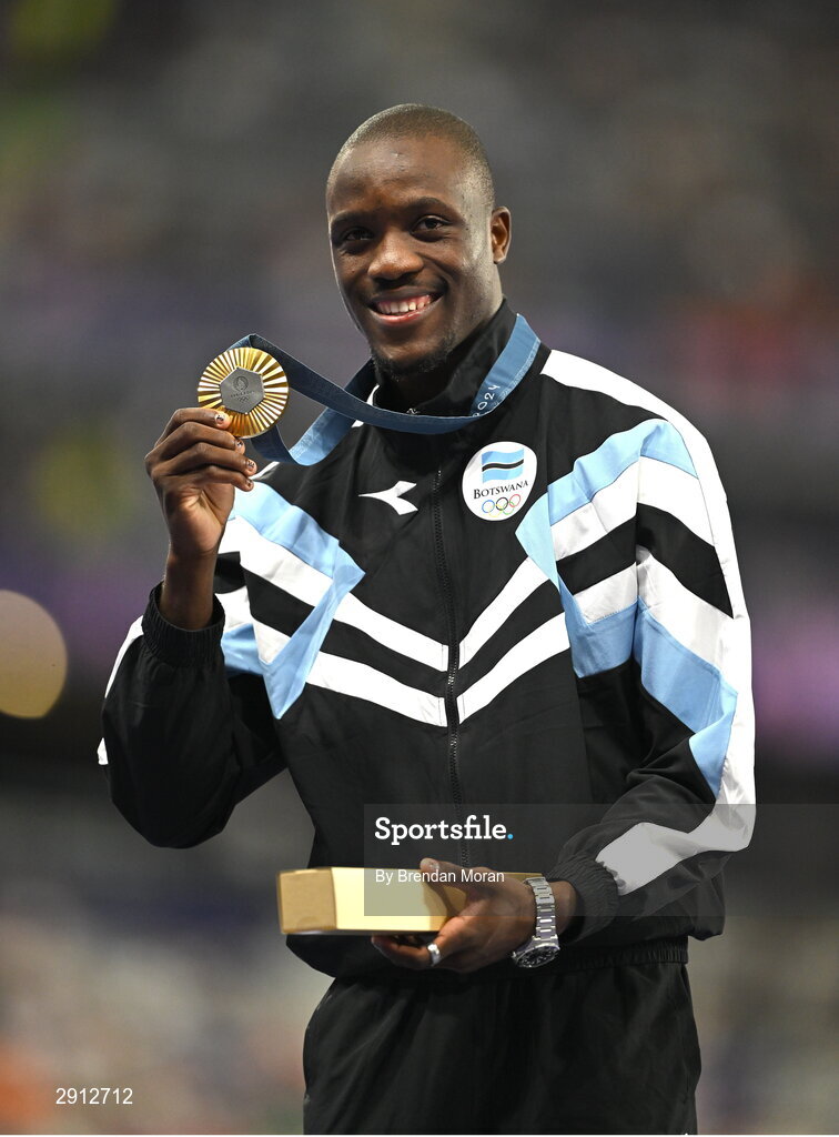 9 August 2024; Letsile Tebogo of Team Botswana celebrates with his men's 200m gold medal at the Stade de France during the 2024 Paris Summer Olympic Games in Paris, France. Photo by Brendan Moran/Sportsfile