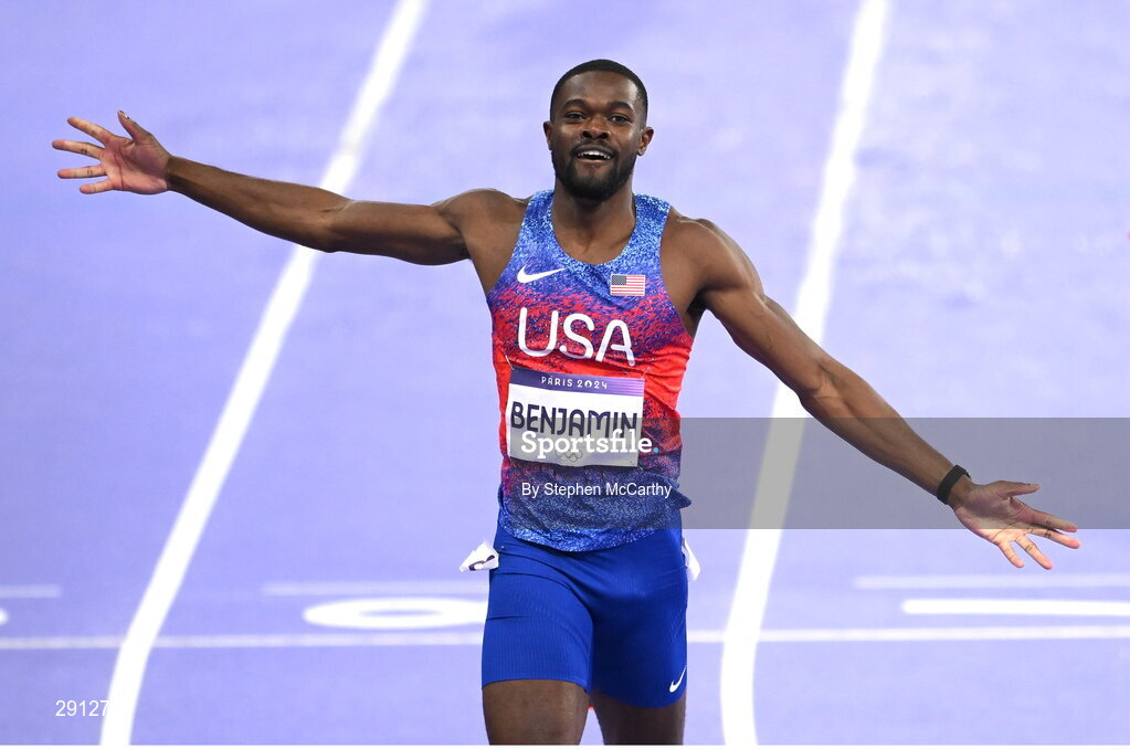 9 August 2024; Rai Benjamin of Team USA celebrates after winning the men's 400m hurdles final at the Stade de France during the 2024 Paris Summer Olympic Games in Paris, France. Photo by Stephen McCarthy/Sportsfile