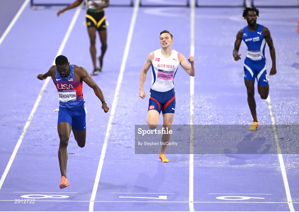 9 August 2024; Rai Benjamin of Team USA, left, on his way to winning the men's 400m hurdles final at the Stade de France during the 2024 Paris Summer Olympic Games in Paris, France. Photo by Stephen McCarthy/Sportsfile
