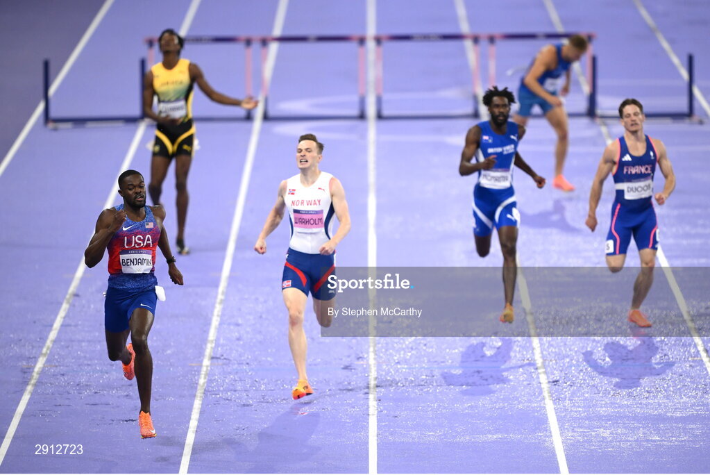 9 August 2024; Rai Benjamin of Team USA, left, on his way to winning the men's 400m hurdles final at the Stade de France during the 2024 Paris Summer Olympic Games in Paris, France. Photo by Stephen McCarthy/Sportsfile