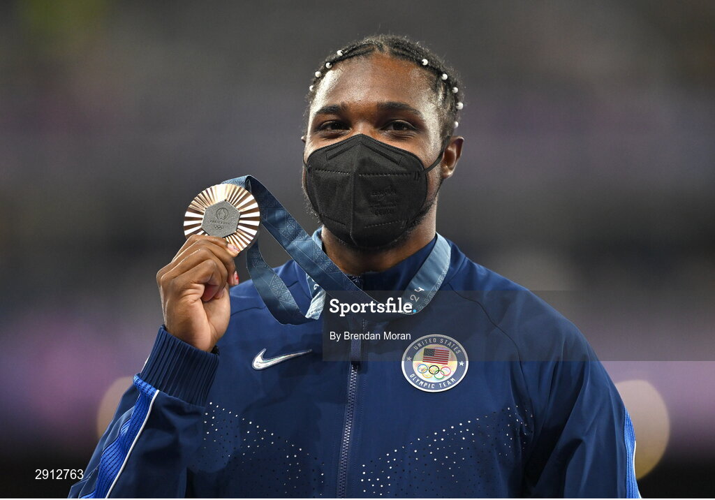 9 August 2024; Noah Lyles of Team USA celebrates with his men's 200m bronze medal at the Stade de France during the 2024 Paris Summer Olympic Games in Paris, France. Photo by Brendan Moran/Sportsfile