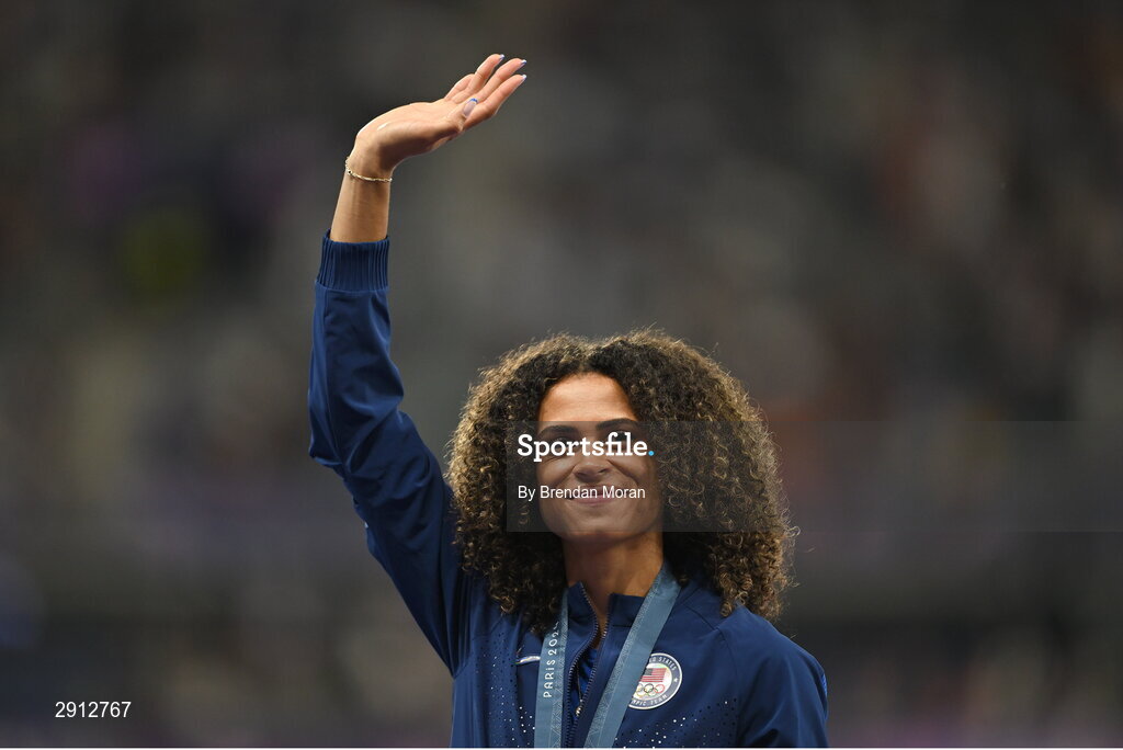 9 August 2024; Sydney McLaughlin-Levrone of Team USA celebrates with her women's 400m hurdles gold medal at the Stade de France during the 2024 Paris Summer Olympic Games in Paris, France. Photo by Brendan Moran/Sportsfile