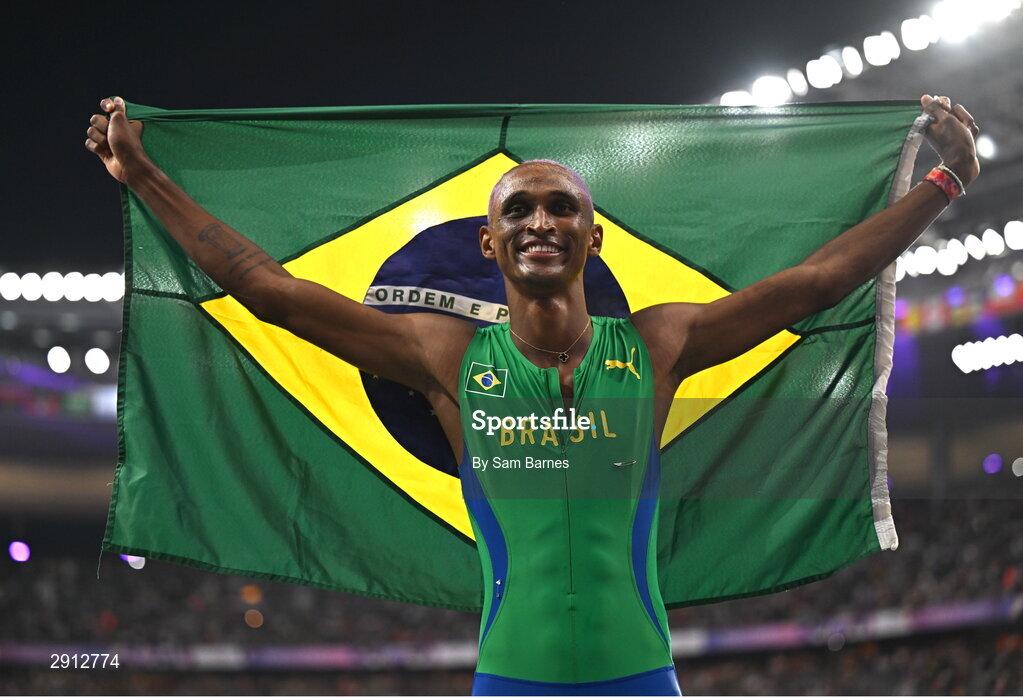 9 August 2024; Alison Dos Santos of Team Brazil celebrates after finishing bronze in the men's 400m hurdles final at the Stade de France during the 2024 Paris Summer Olympic Games in Paris, France. Photo by Sam Barnes/Sportsfile