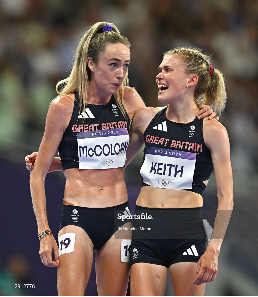 9 August 2024; Eilish McColgan, left, and Megan Keith of Team Great Britain after the women's 10,000m final at the Stade de France during the 2024 Paris Summer Olympic Games in Paris, France. Photo by Brendan Moran/Sportsfile