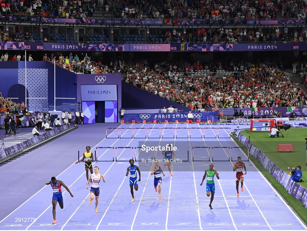 9 August 2024; Rai Benjamin of Team USA, left, on his way to winning the men's 400m hurdles final at the Stade de France during the 2024 Paris Summer Olympic Games in Paris, France. Photo by Stephen McCarthy/Sportsfile