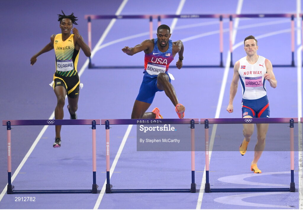 9 August 2024; Rai Benjamin of Team USA, centre, on his way to winning the men's 400m hurdles final at the Stade de France during the 2024 Paris Summer Olympic Games in Paris, France. Photo by Stephen McCarthy/Sportsfile