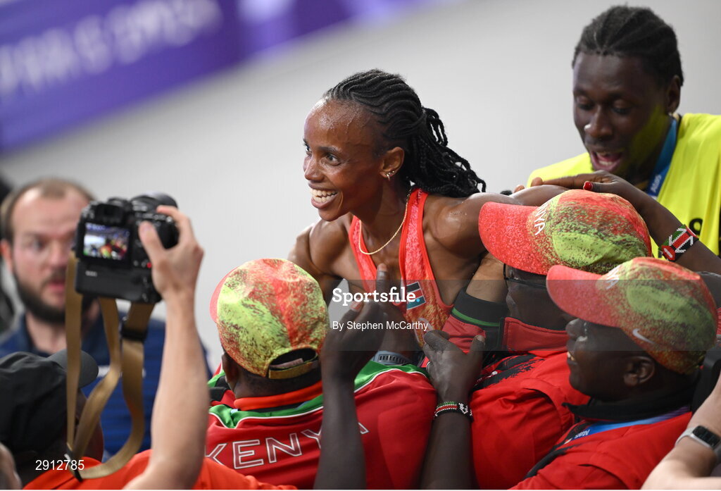 9 August 2024; Beatrice Chebet of Team Kenya celebrates after winning the women's 10,000m final at the Stade de France during the 2024 Paris Summer Olympic Games in Paris, France. Photo by Stephen McCarthy/Sportsfile