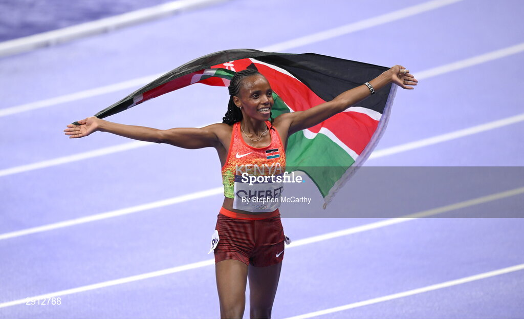 9 August 2024; Beatrice Chebet of Team Kenya celebrates after winning the women's 10,000m final at the Stade de France during the 2024 Paris Summer Olympic Games in Paris, France. Photo by Stephen McCarthy/Sportsfile
