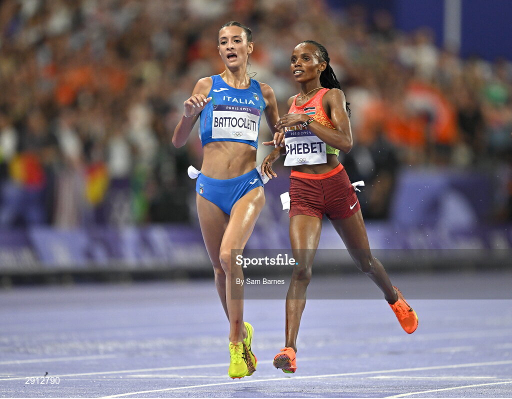 9 August 2024; Beatrice Chebet of Team Kenya, right, on her way to winning the women's 10,000m final ahead of Nadia Battocletti of Team Italy at the Stade de France during the 2024 Paris Summer Olympic Games in Paris, France. Photo by Sam Barnes/Sportsfile