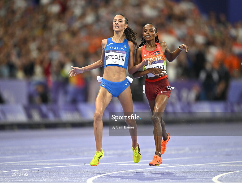 9 August 2024; Beatrice Chebet of Team Kenya, right, on her way to winning the women's 10,000m final ahead of Nadia Battocletti of Team Italy at the Stade de France during the 2024 Paris Summer Olympic Games in Paris, France. Photo by Sam Barnes/Sportsfile