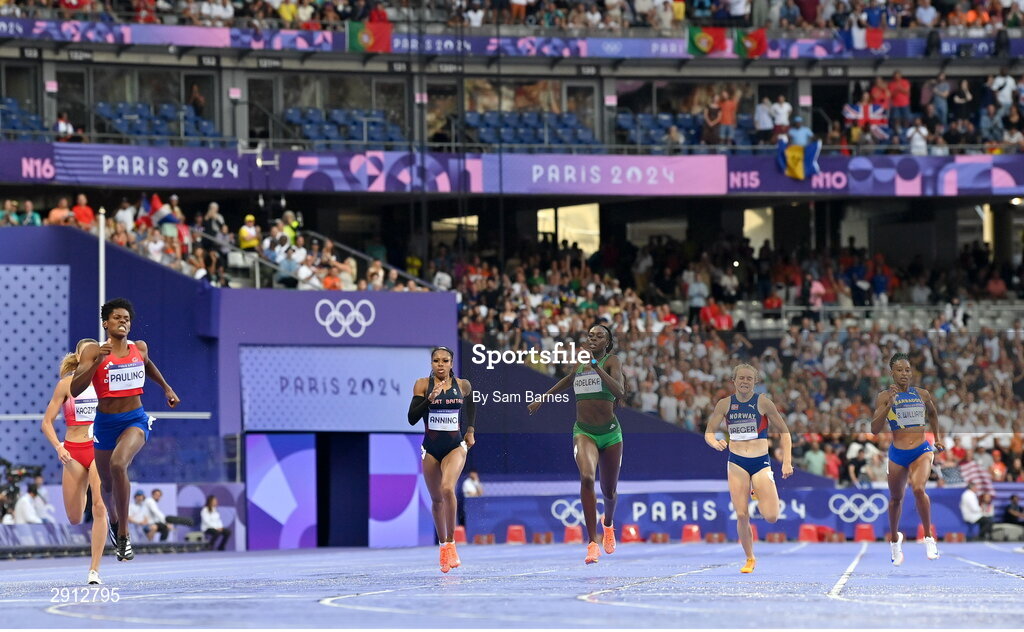 9 August 2024; Rhasidat Adeleke of Team Ireland, third from right, on her way to finishing fourth in the women's 400m final at the Stade de France during the 2024 Paris Summer Olympic Games in Paris, France. Photo by Sam Barnes/Sportsfile