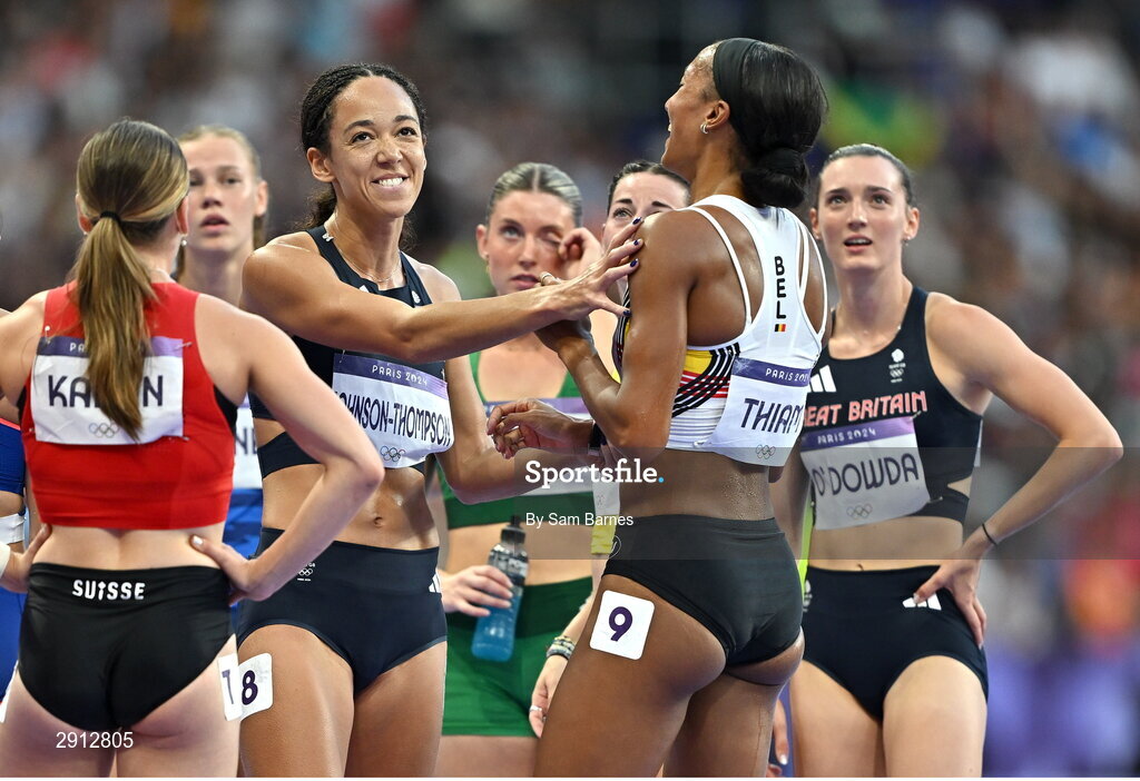 9 August 2024; Katarina Johnson-Thompson of Team Great Britain, left, and Nafissatou Thiam of Team Belgium after the women's heptathlon 800m final at the Stade de France during the 2024 Paris Summer Olympic Games in Paris, France. Photo by Sam Barnes/Sportsfile