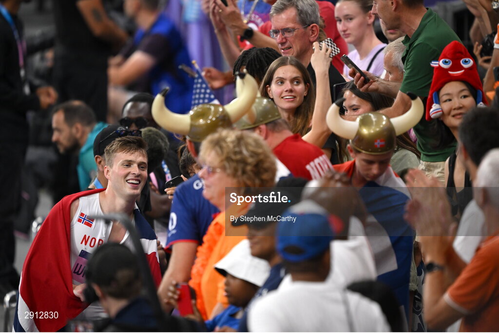 9 August 2024; Karsten Warholm Team Norway after the men's 400m hurdles final at the Stade de France during the 2024 Paris Summer Olympic Games in Paris, France. Photo by Stephen McCarthy/Sportsfile