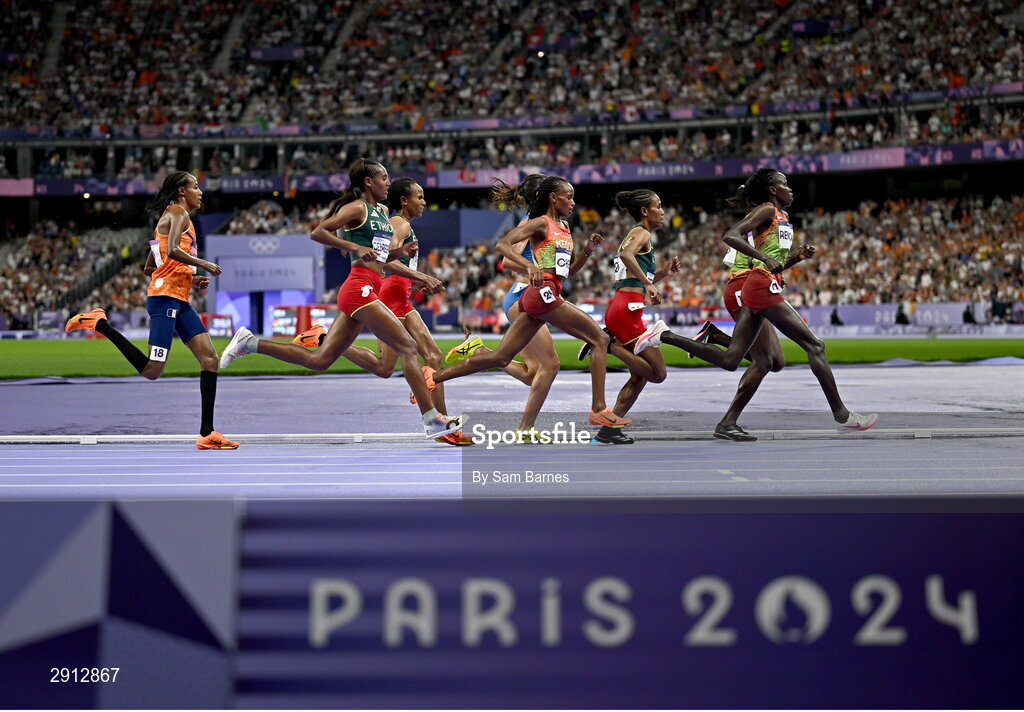 9 August 2024; A general view of the leading group on their last lap during the women's 10,000m final at the Stade de France during the 2024 Paris Summer Olympic Games in Paris, France. Photo by Sam Barnes/Sportsfile
