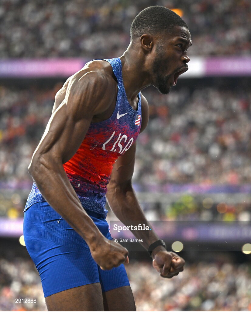 9 August 2024; Rai Benjamin of Team USA celebrates after winning the men's 400m hurdles final at the Stade de France during the 2024 Paris Summer Olympic Games in Paris, France. Photo by Sam Barnes/Sportsfile