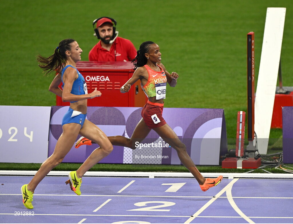 9 August 2024; Beatrice Chebet of Team Kenya, right, on her way to winning the women's 10,000m final at the Stade de France during the 2024 Paris Summer Olympic Games in Paris, France. Photo by Brendan Moran/Sportsfile