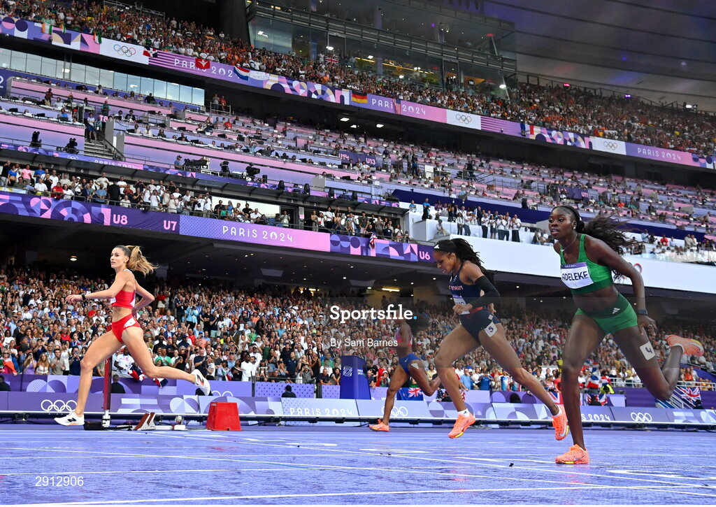 9 August 2024; Rhasidat Adeleke of Team Ireland, right, crosses the finish line to finish fourth in the women's 400m final at the Stade de France during the 2024 Paris Summer Olympic Games in Paris, France. Photo by Sam Barnes/Sportsfile