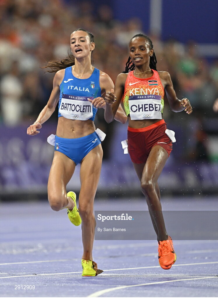 9 August 2024; Beatrice Chebet of Team Kenya, right, on her way to winning the women's 10,000m final ahead of Nadia Battocletti of Team Italy at the Stade de France during the 2024 Paris Summer Olympic Games in Paris, France. Photo by Sam Barnes/Sportsfile