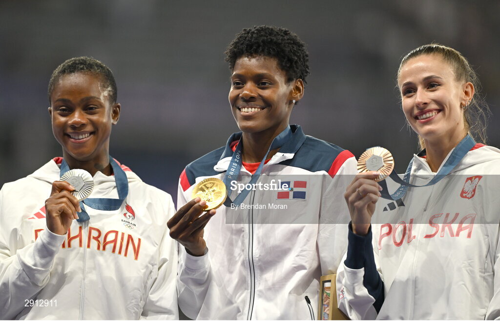 9 August 2024; Women's 400m medalists, from left, silver medalist Salwa Eid Naser, gold medalist Marileidy Paulino of Team Dominican Republic and bronze medalist Natalia Kaczmarek of Team Poland at the Stade de France during the 2024 Paris Summer Olympic Games in Paris, France. Photo by Brendan Moran/Sportsfile