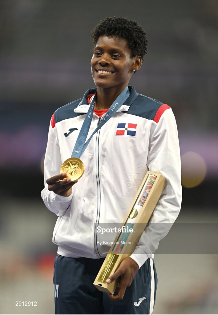 9 August 2024; Marileidy Paulino of Team Dominican Republic celebrates with her women's 400m gold medal at the Stade de France during the 2024 Paris Summer Olympic Games in Paris, France. Photo by Brendan Moran/Sportsfile