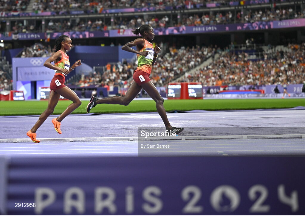 9 August 2024; Margaret Chelimo Kipkemboi of Team Kenya, right, leads the field in the women's 10,00m final at the Stade de France during the 2024 Paris Summer Olympic Games in Paris, France. Photo by Sam Barnes/Sportsfile