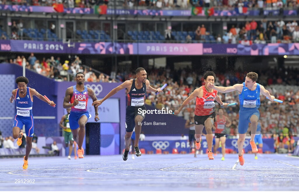 9 August 2024; Zharnel Hughes of Team Great Britain, third from right, crosses the finish line to win bronze in the men's 4x100m relay final at the Stade de France during the 2024 Paris Summer Olympic Games in Paris, France. Photo by Sam Barnes/Sportsfile