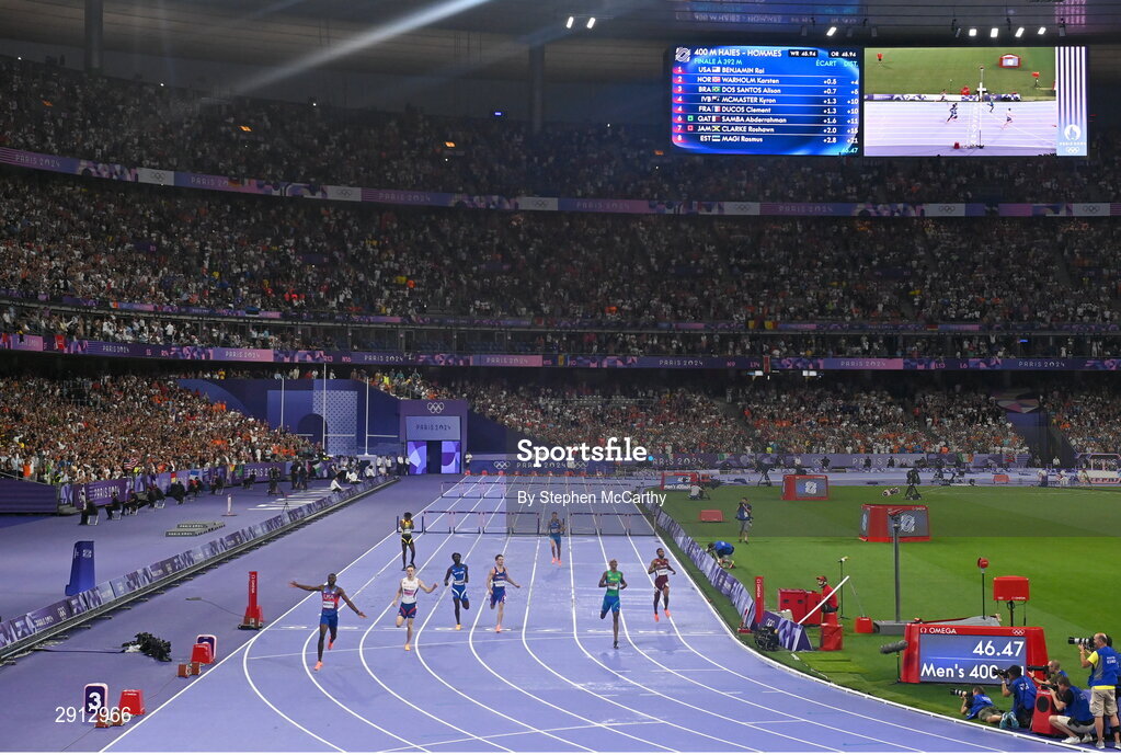 9 August 2024; Rai Benjamin of Team USA, left, celebrates after winning the men's 400m hurdles final at the Stade de France during the 2024 Paris Summer Olympic Games in Paris, France. Photo by Stephen McCarthy/Sportsfile
