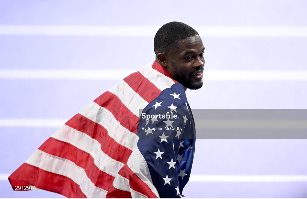 9 August 2024; Rai Benjamin of Team USA celebrates after winning the men's 400m hurdles final at the Stade de France during the 2024 Paris Summer Olympic Games in Paris, France. Photo by Stephen McCarthy/Sportsfile