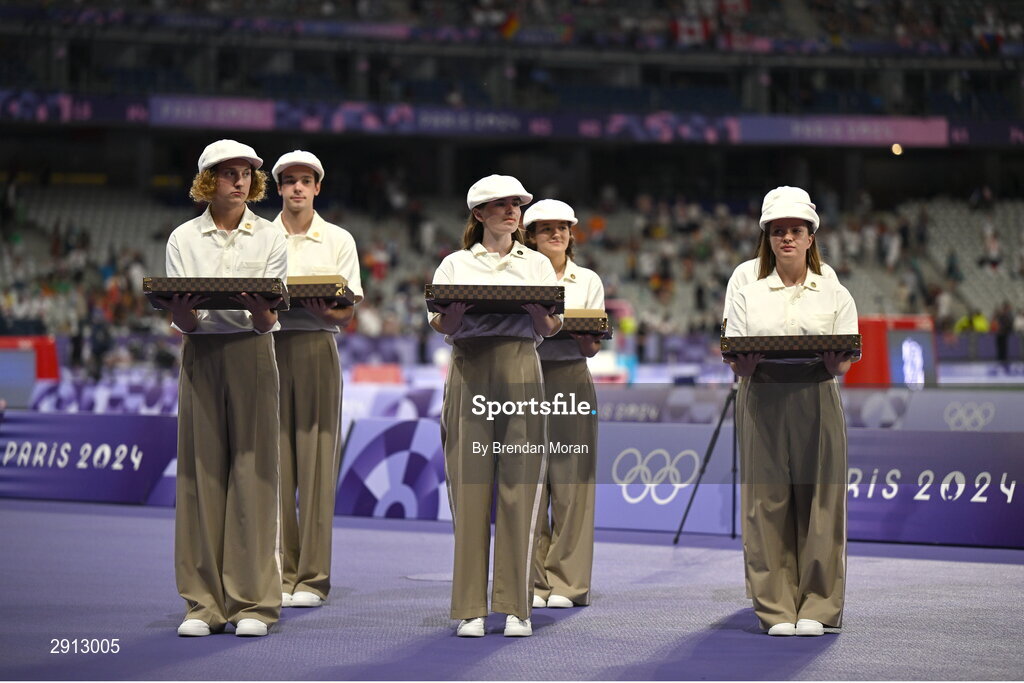 9 August 2024;A general view of volunteers at the medal ceremony at the Stade de France during the 2024 Paris Summer Olympic Games in Paris, France. Photo by Brendan Moran/Sportsfile