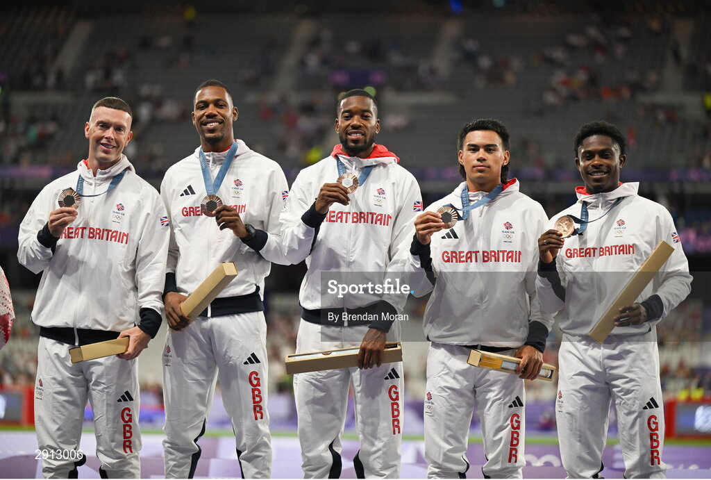 9 August 2024; Team Great Britain athletes, from left, Richard Kilty, Zharnel Hughes, Nethaneel Mitchell-Blake, Louie Hinchliffe and Jeremiah Azu celebrate with their men's 4x100m relay bronze medals at the Stade de France during the 2024 Paris Summer Olympic Games in Paris, France. Photo by Brendan Moran/Sportsfile