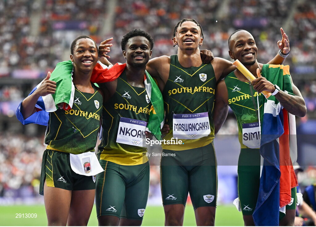 9 August 2024; Team South Africa athletes, from left, Bayanda Walaza, Bradley Nkoana, Shaun Maswanganyi and Akani Simbine celebrate after winning silver in the men's 4x100m relay final at the Stade de France during the 2024 Paris Summer Olympic Games in Paris, France. Photo by Sam Barnes/Sportsfile