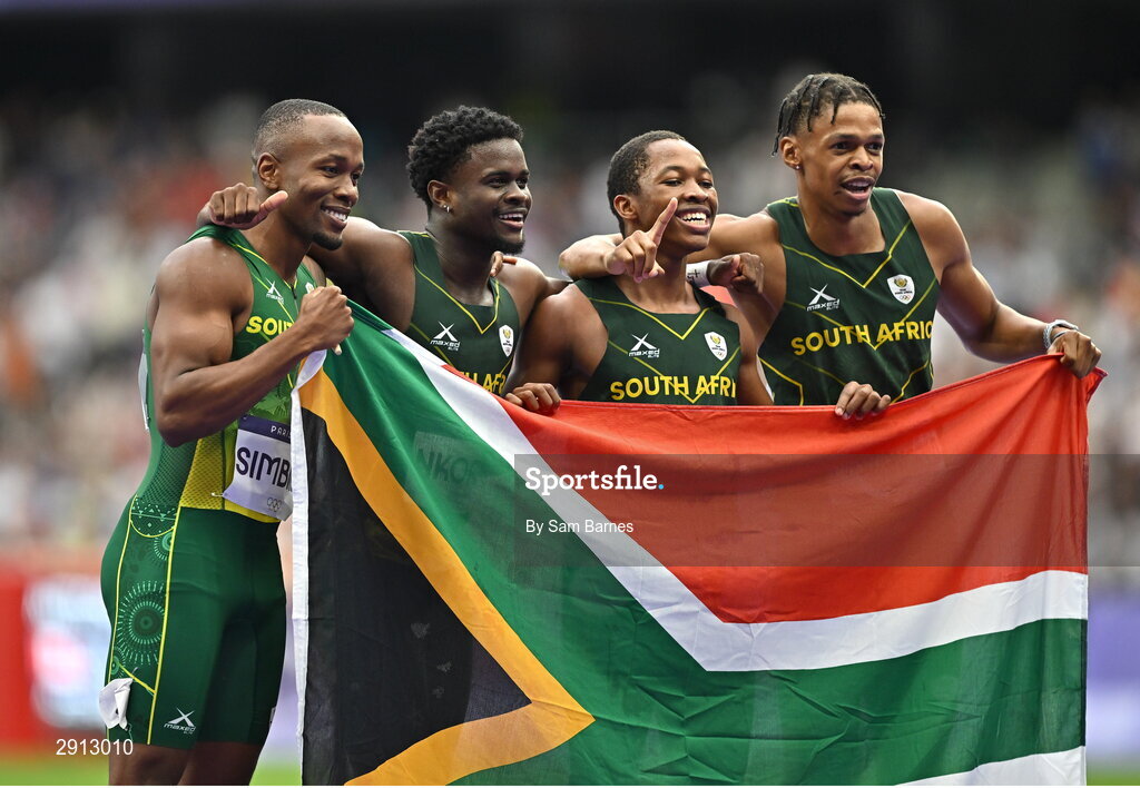 9 August 2024; Team South Africa athletes celebrate after winning silver in the men's 4x100m relay final at the Stade de France during the 2024 Paris Summer Olympic Games in Paris, France. Photo by Sam Barnes/Sportsfile