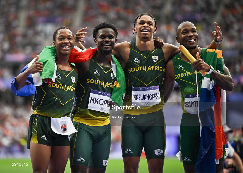 9 August 2024; Team South Africa athletes, from left, Bayanda Walaza, Bradley Nkoana, Shaun Maswanganyi and Akani Simbine celebrate after winning silver in the men's 4x100m relay final at the Stade de France during the 2024 Paris Summer Olympic Games in Paris, France. Photo by Sam Barnes/Sportsfile