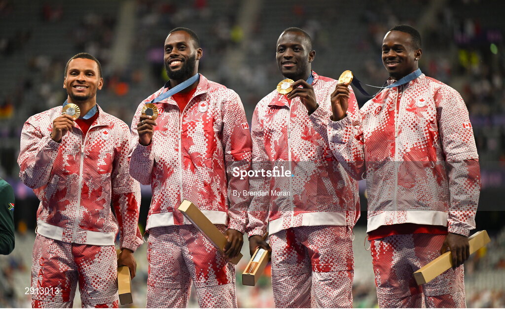 9 August 2024; Team Canada athletes, from left, Andre De Grasse, Brendon Rodney, Jerome Blake and Aaron Brown celebrate with their men's 4x100m relay gold medals at the Stade de France during the 2024 Paris Summer Olympic Games in Paris, France. Photo by Brendan Moran/Sportsfile