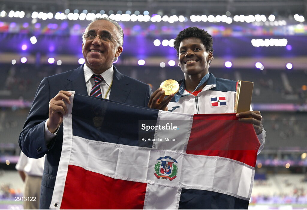 9 August 2024; Women's 400m gold medalist Marileidy Paulino of Team Dominican Republic with International Olympic Committee member Luis Mejía Oviedo at the Stade de France during the 2024 Paris Summer Olympic Games in Paris, France. Photo by Brendan Moran/Sportsfile